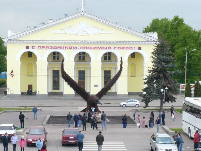 Вообще то орел этот стоит ИМЕННО ЛИЦОМ к вокзалу,а то здание,к чему он жопой-Дворец культуры железнодорожников!)))))))