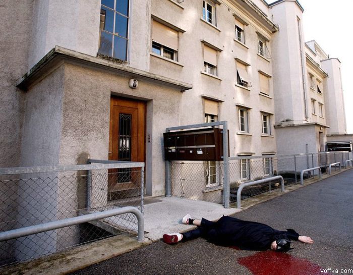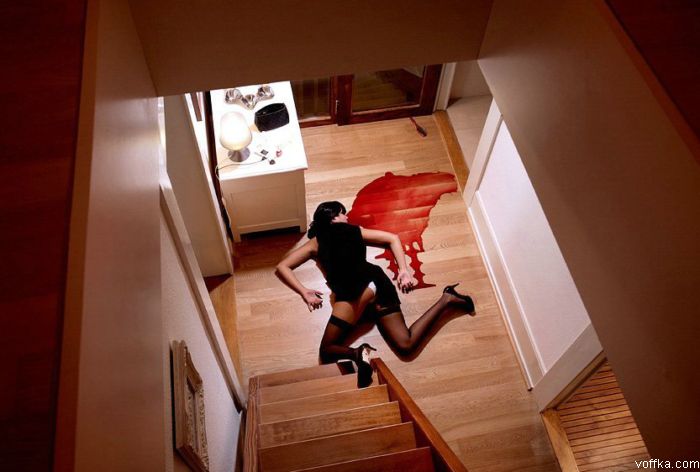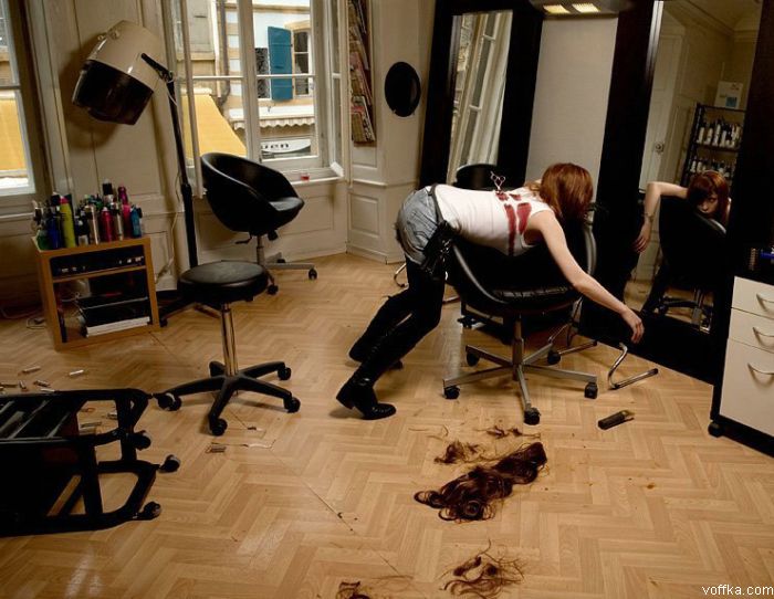 Бутер! Даже не реалестично. Баба в парикмахерской явно держится на ногах, а чувак в капкане явно сдох от того, что обосрался. А бабу возле лифта явно не начиловали ибо она в трусах. Видимо у нее начались месячные в лифте и она от страха окачурилась.