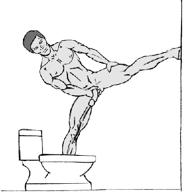 Этот метод работает практически для всех, однако он слегка сложен для применения, и, если кто-то прогуливается за вашей спиной, способен породить массу вопросов. Встаньте спиной к унитазу, расставьте ноги на ширине плеч (в большинстве случаев этого достаточно). Согнитесь вперед в талии, пока не коснетесь пола ( или противоположной стенки, трубы в зависимости от планировки вашей ванной комнаты). Выровняйте положение вашего шланга относительно входного отверстия унитаза, начинайте. Не прогибайте спину. Если вы застряли – просто представьте, что вы занимаетесь йогой по утрам и переходите к следующему упражнению.