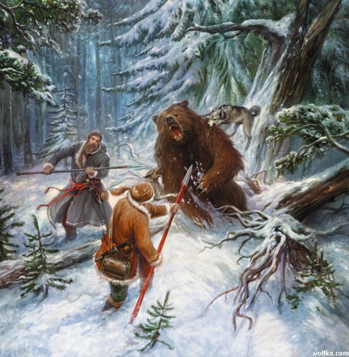 именно вторая картинга - с грубыми ошибками: на медведя ходили не с копьями, а с рогатинами: имеющими цельнокованную с острием перекладину, чтобы уколотый медведь не добрался до охотника
