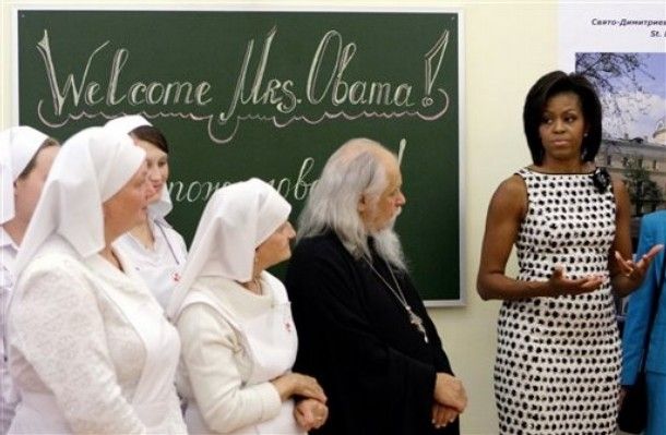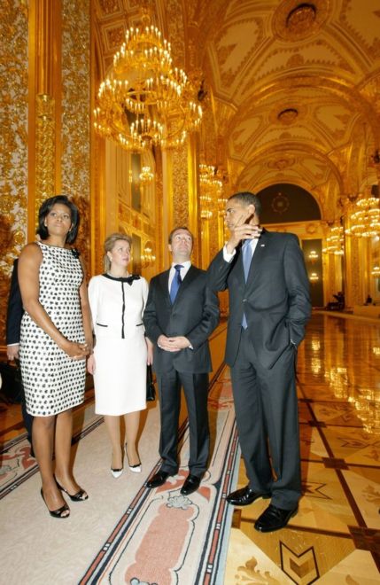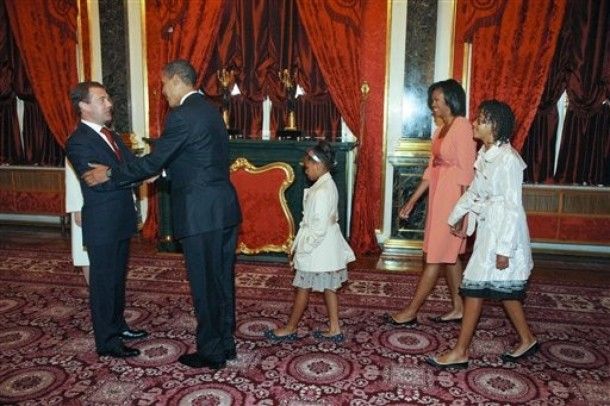 Под торжественные звуки hip-hop семья Обама, пританцовывая, зашла в кремлевский зал поприветствовать российского президента.