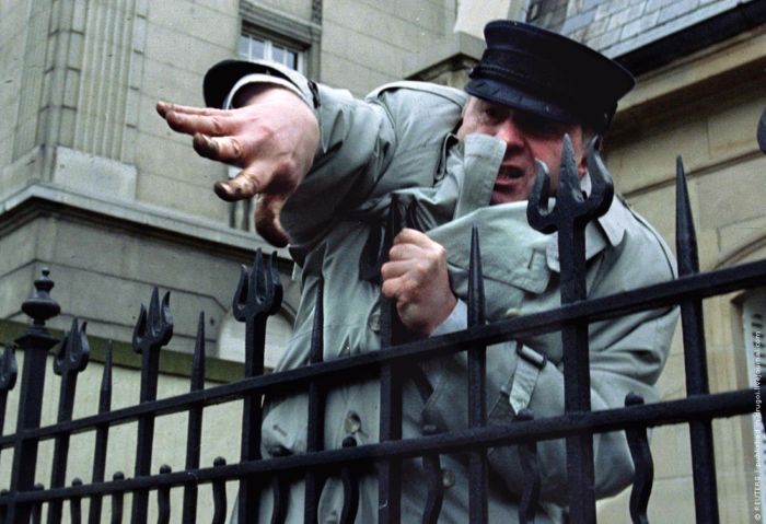 Владимир Жириновский за оградой российского консульства забрасывает землей и камнями еврейских студентов, обвинивших его в антисемитизме. Страсбург, 11 апреля 1994 г.