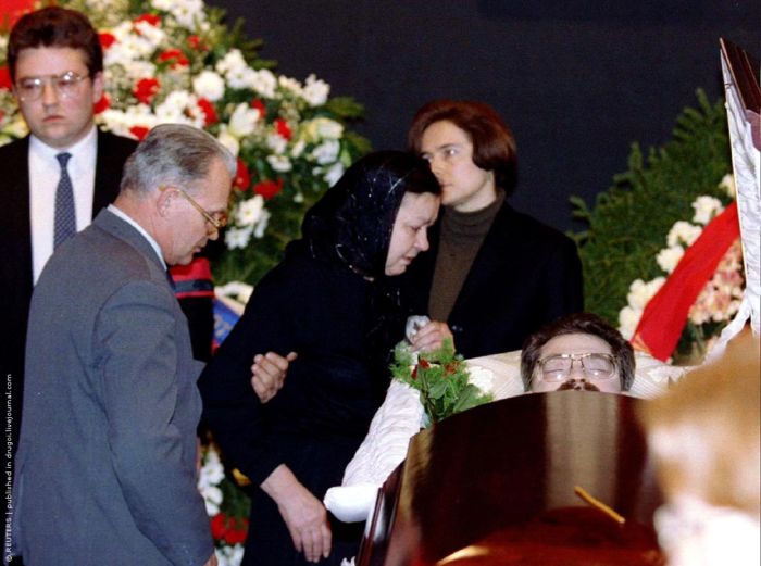 Мать застреленного в подъезде своего дома телеведущего Владислава Листьева у гроба с телом сына. Москва, 3 марта 1995 г.