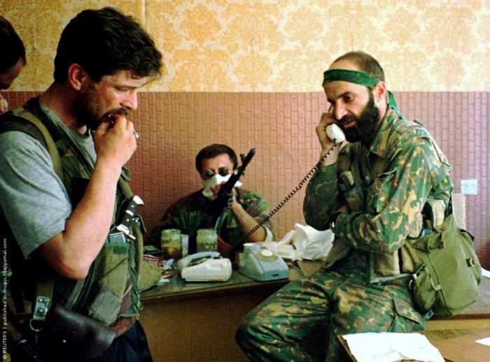 Командир отряда чеченских боевиков Шамиль Басаев во время захвата больницы в Буденновске, 19 июня 1995 г.