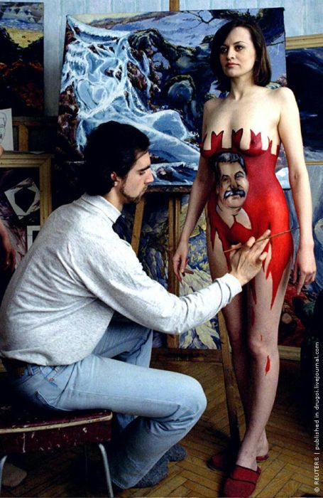 Художник Григорий Федоров заканчивает рисунок на теле танцовщицы перед открытием ночного клуба. Москва, апрель 1995 г.