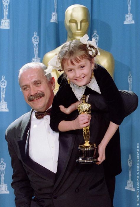 Кинорежиссер Никита Михалков с дочерью Надей и только что полученным "Оскаром" за фильм "Утомленные солнцем". США, 28 марта 1995 г.